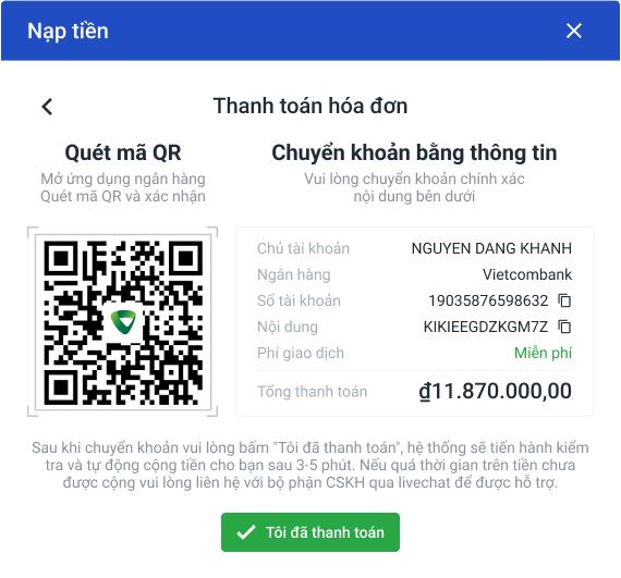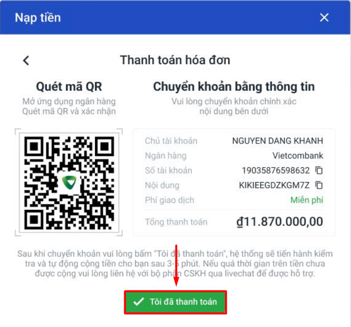 Bước 7: Sau khi chuyển khoản thành công, người dùng vui lòng bấm Tôi đã thanh toán để hệ thống có thể kiểm tra và cộng tiền số dư ví chính.