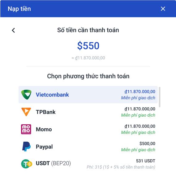 Bước 3: Sau khi bấm nút Nạp tiền, một Popup sẽ hiện lên