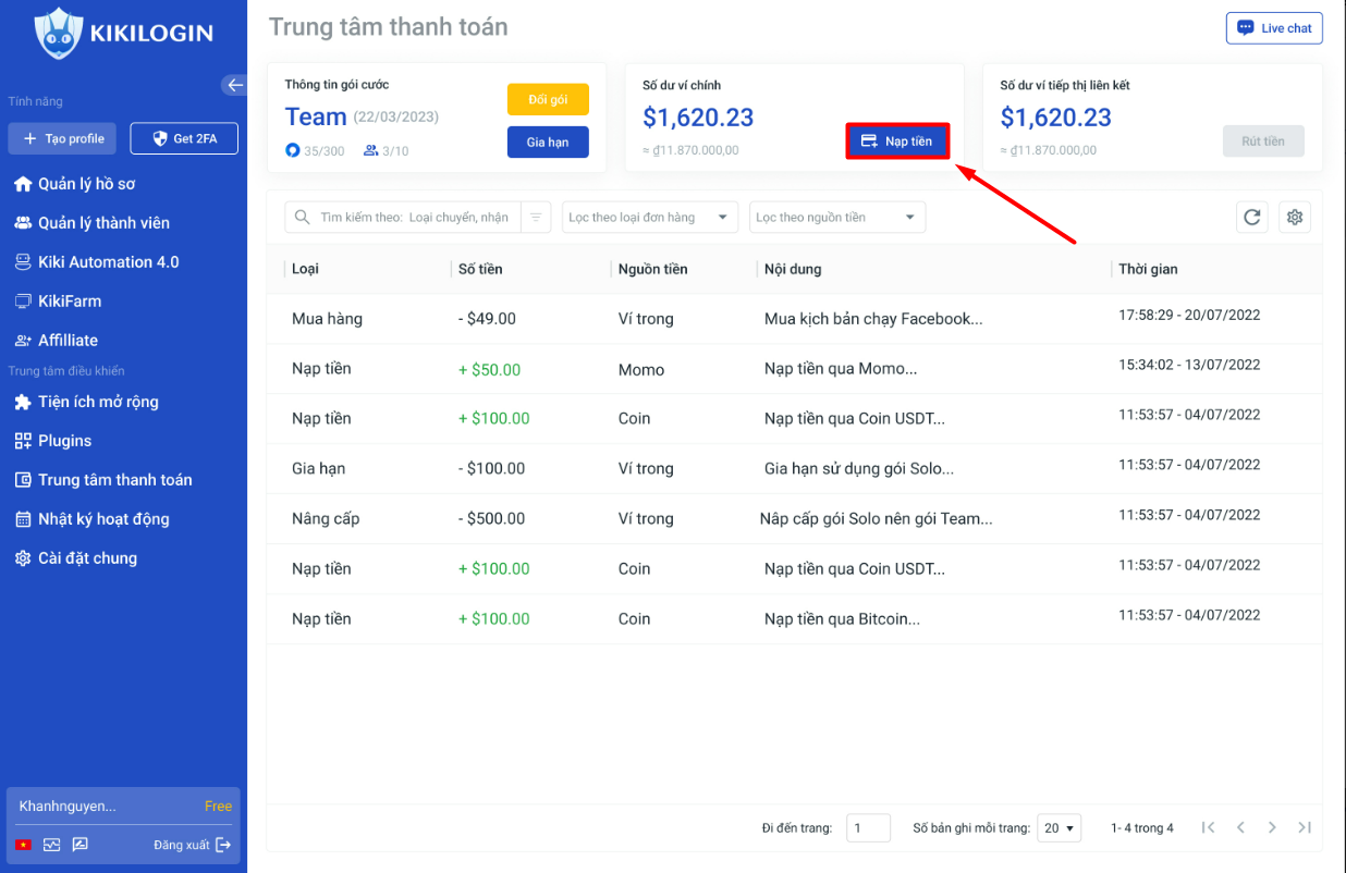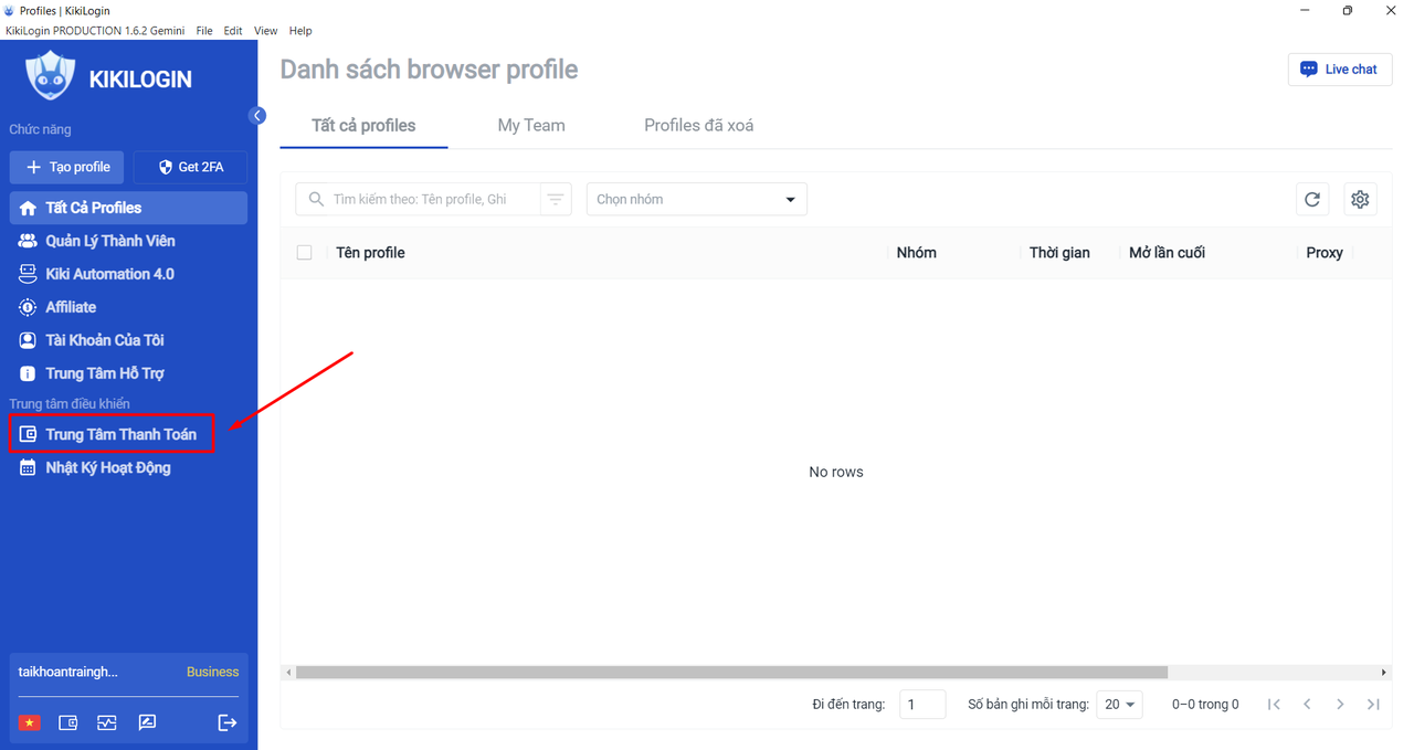Bước 1: Tại màn hình chính của phần mềm KikiLogin, bấm chọn Trung tâm thanh toán ở góc bên trái màn hình.