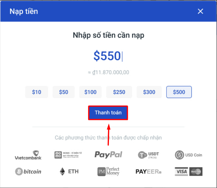 Bước 4: Sau khi nhập số tiền cần nạp, người dùng bấm nút Thanh toán