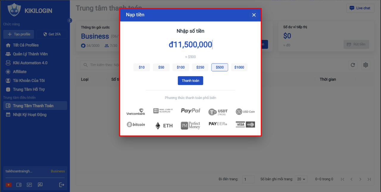 Các cách thanh toán được hỗ trợ trên KikiLogin
