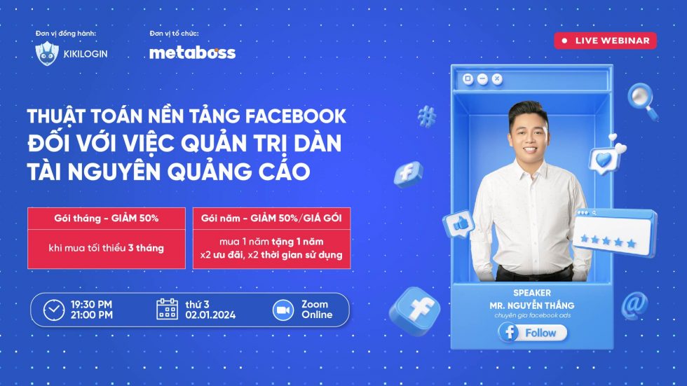 Tiền đề để quảng cáo được hiệu quả, việc tối ưu hóa tài khoản quảng cáo và cách tổ chức, sắp xếp và chuẩn bị một chiến dịch quảng cáo toàn diện là yếu tố quan trọng cần được đảm bảo. Vì vậy, để tìm ra giải pháp cho những thắc mắc và khó khăn mà bạn đang gặp phải trong quá trình quảng cáo, tất cả vấn đề sẽ được trả lời tại Webinar “Thuật toán nền tảng Facebook đối với việc quản trị dàn tài nguyên quảng cáo” do MetaBoss cùng đơn vị đồng hành KikiLogin phối hợp tổ chức.