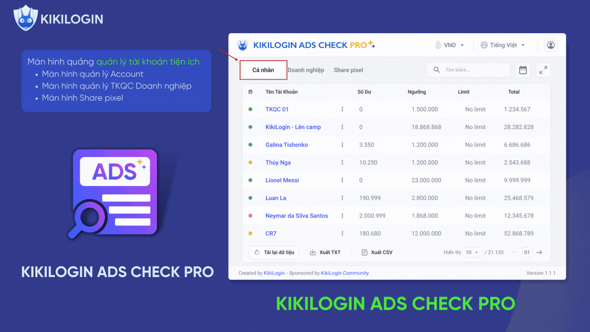 - Xuất báo cáo dữ liệu về tài khoản quảng cáo cá nhân và tài khoản doanh nghiệp của bạn thành file .xlsx và .txt thuận tiện sử dụng trong thống kê báo cáo chiến dịch.