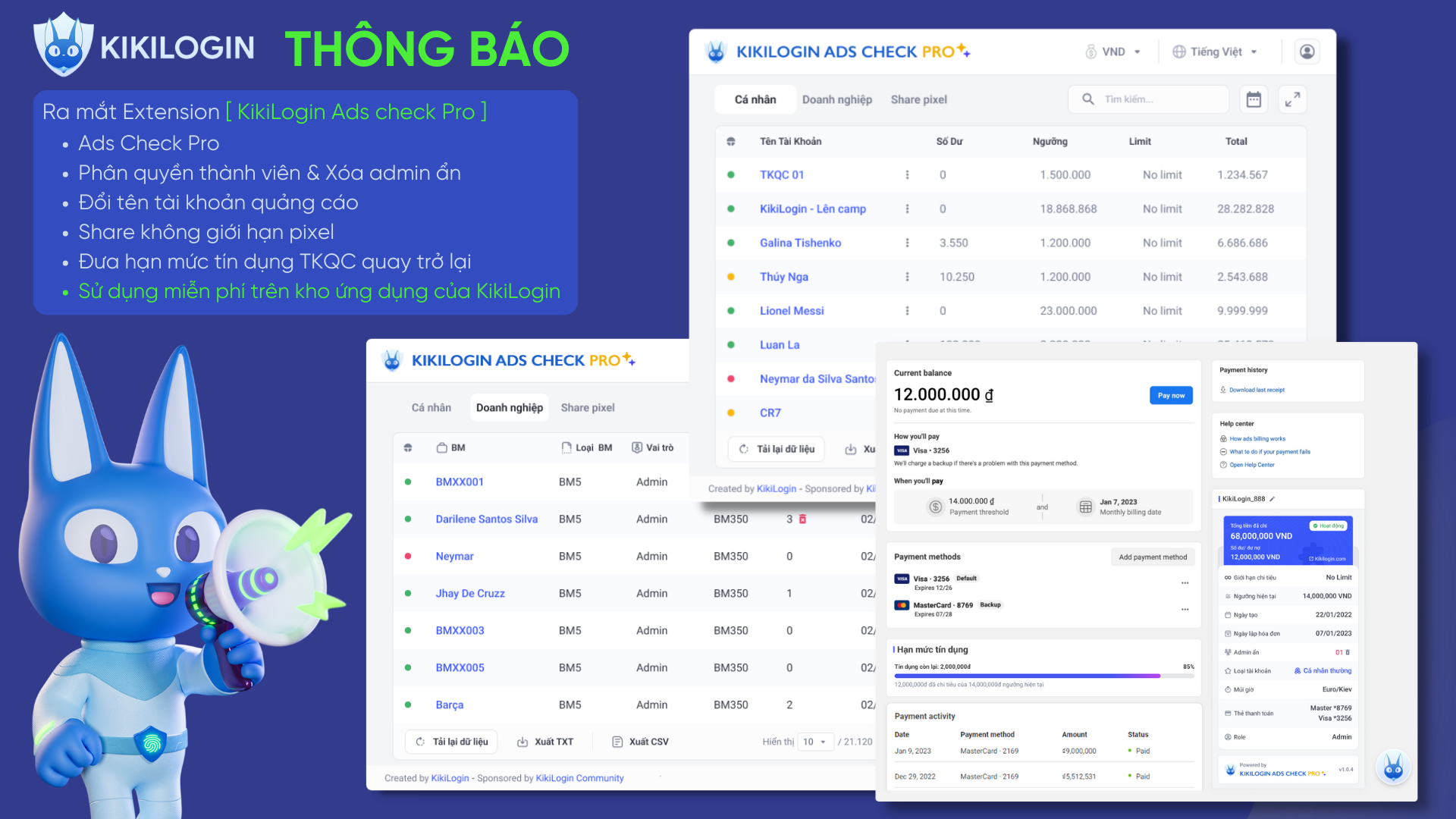 Extension KikiLogin Ads Check Pro là một tiện ích mở rộng của KikiLogin cho phép nhà quảng cáo chuyên nghiệp theo dõi và quản lý các tài khoản quảng cáo doanh nghiệp và tài khoản quảng cáo cá nhân miễn phí và đầy đủ tính năng tại một nơi giúp việc hoạt động quản lý quảng cáo được tập trung và hiệu quả. Người dùng có thể sử dụng tính năng này tại Kho ứng dụng Extension