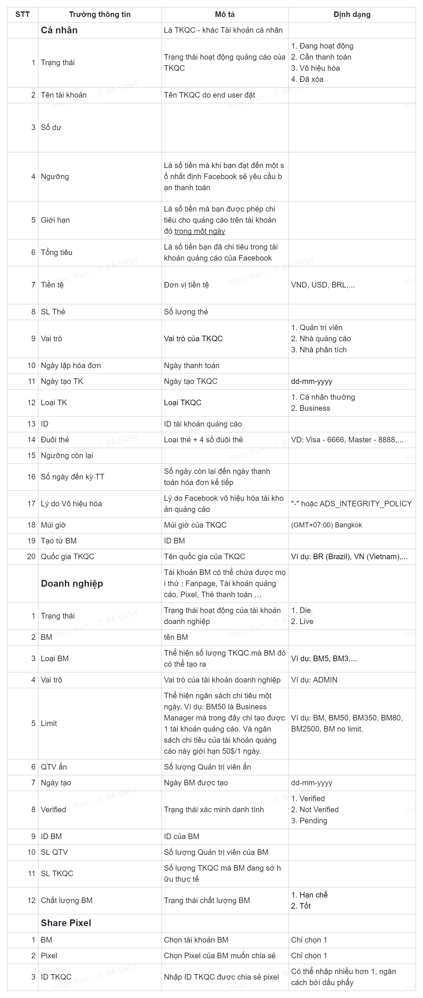 Danh sách trường dữ liệu hiển thị trong bảng dữ liệu tài khoản quảng cáo được xuất ra từ KikiLogin Ads check Pro