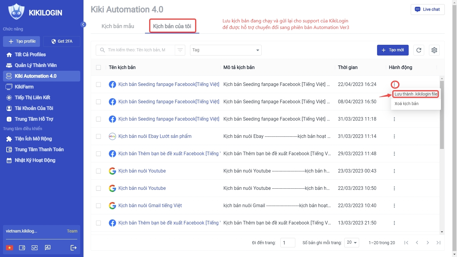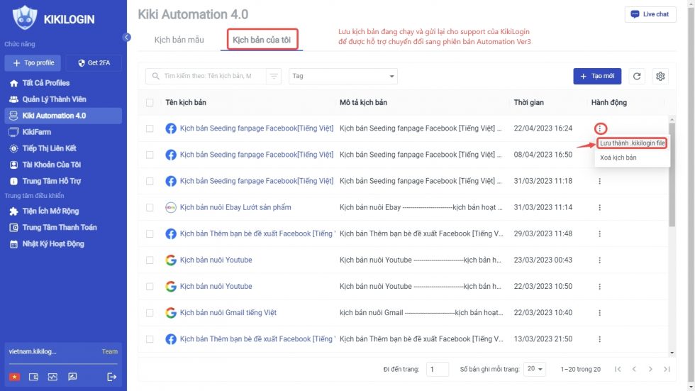 Lưu ý: Tất cả các kịch bản cũ của bản Ver2 sẽ không thể hoạt động người dùng nên truy cập “Kịch bản của tôi” => Click “…: => “Lưu thành .kikilogin”